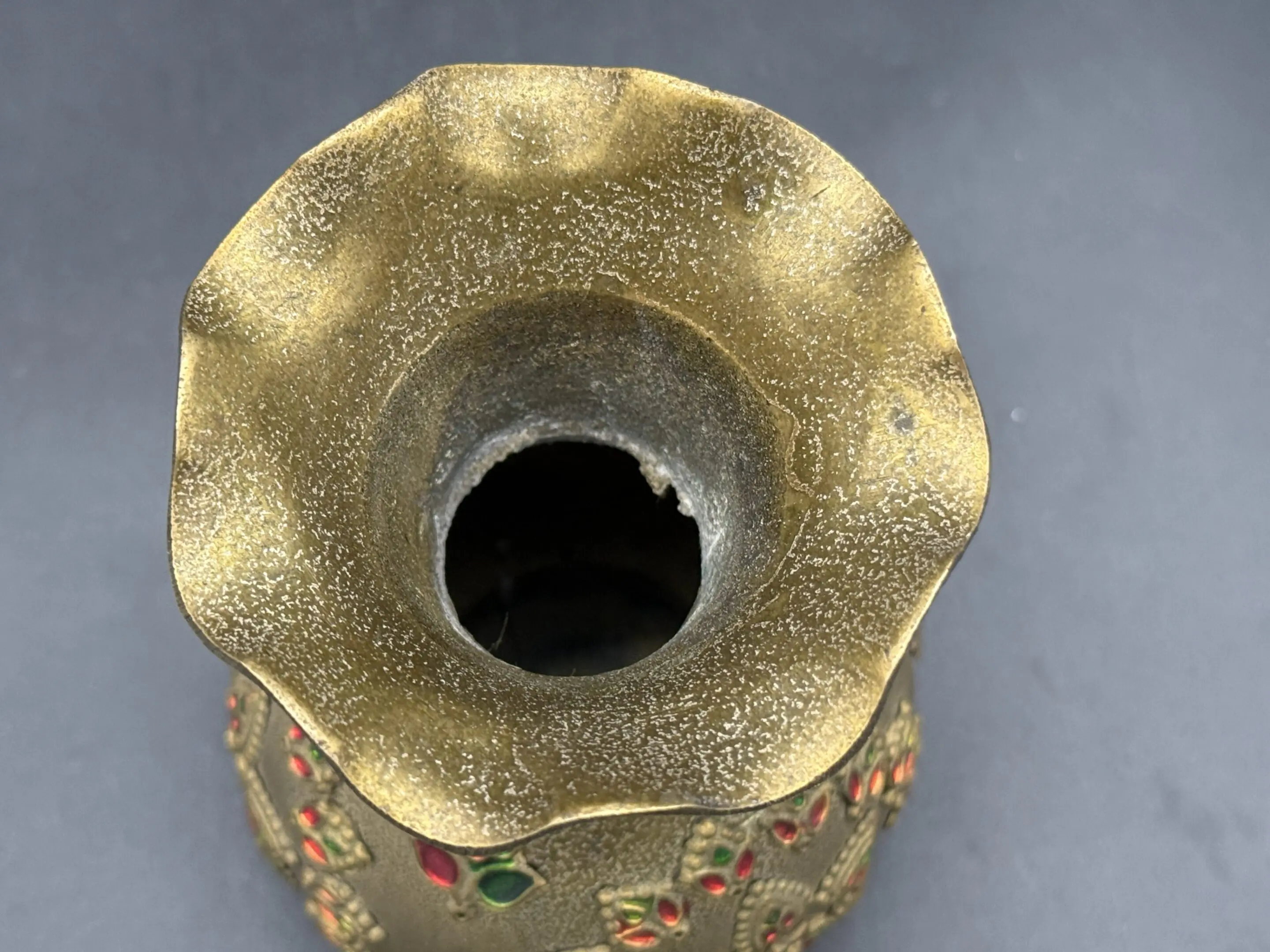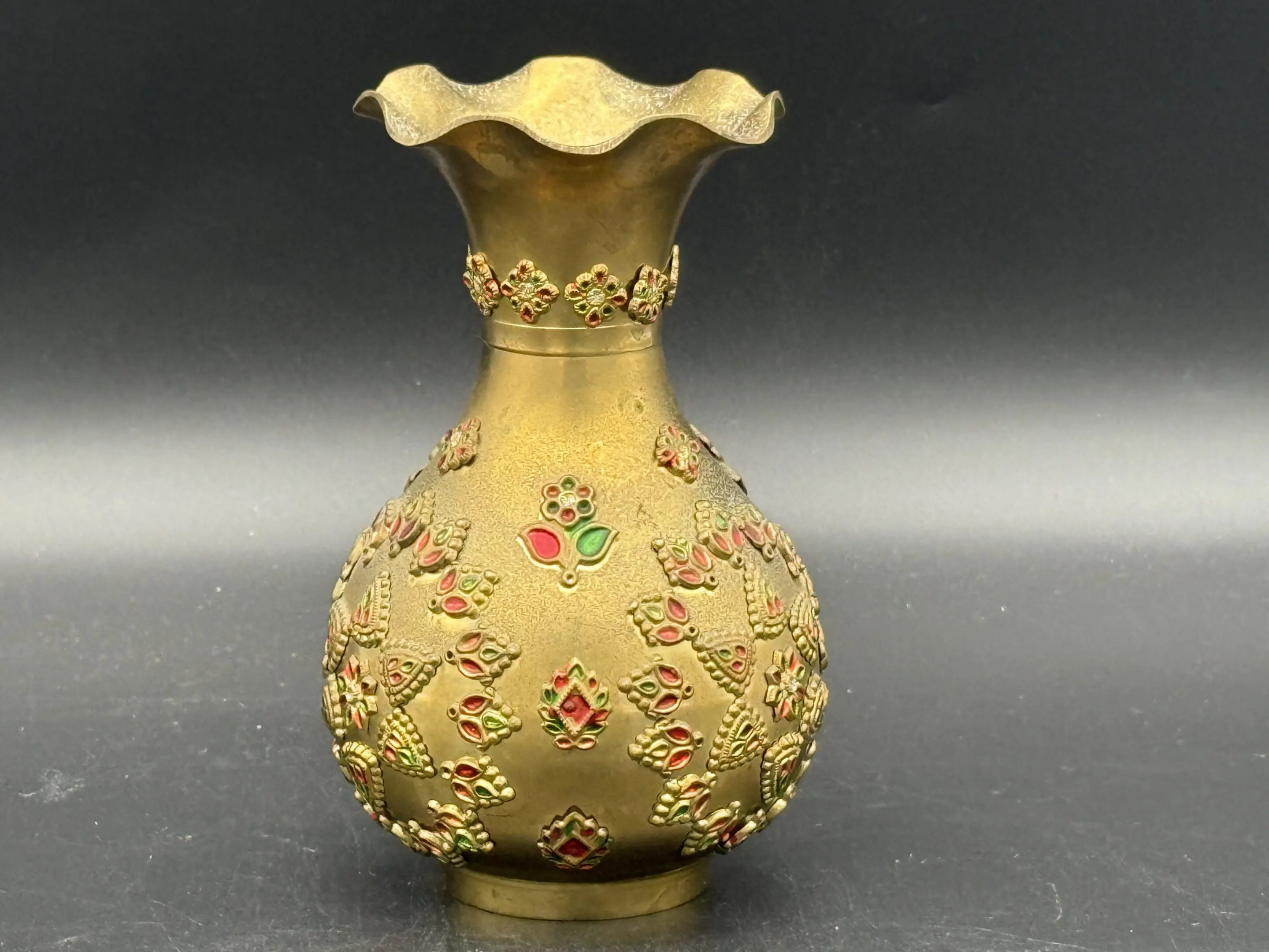 Antique Indian Brass Vase with Enameled Floral Embellishments