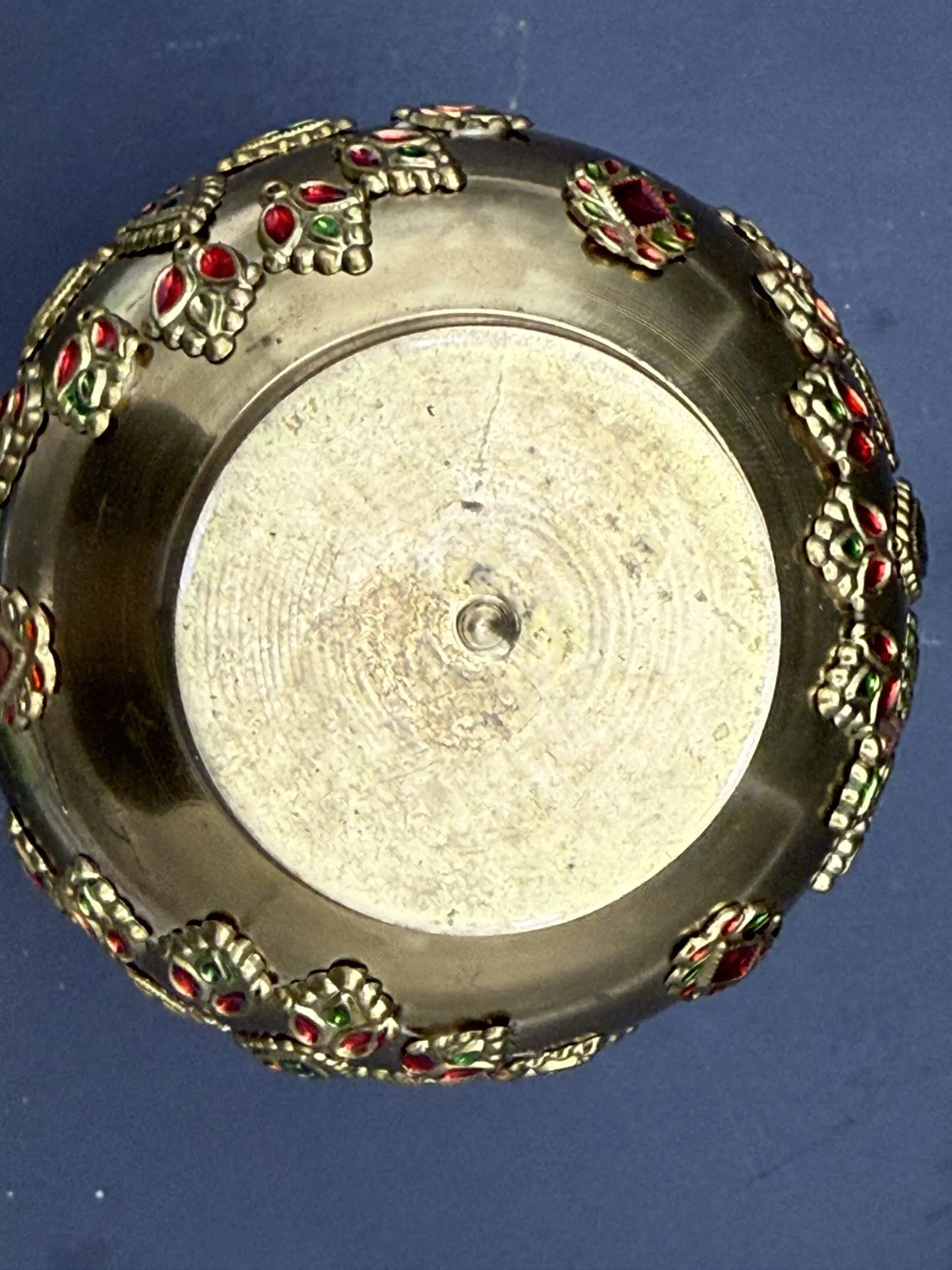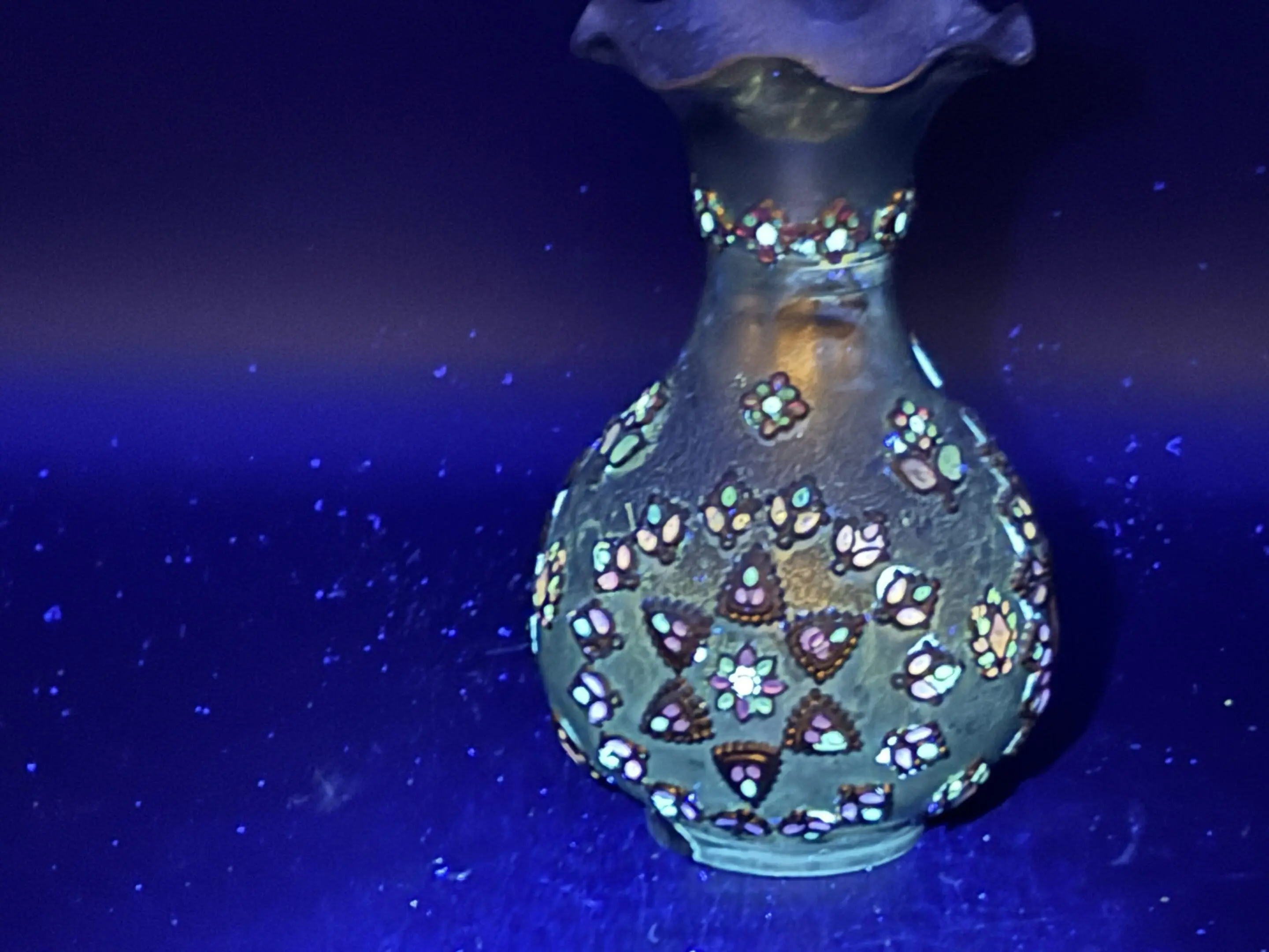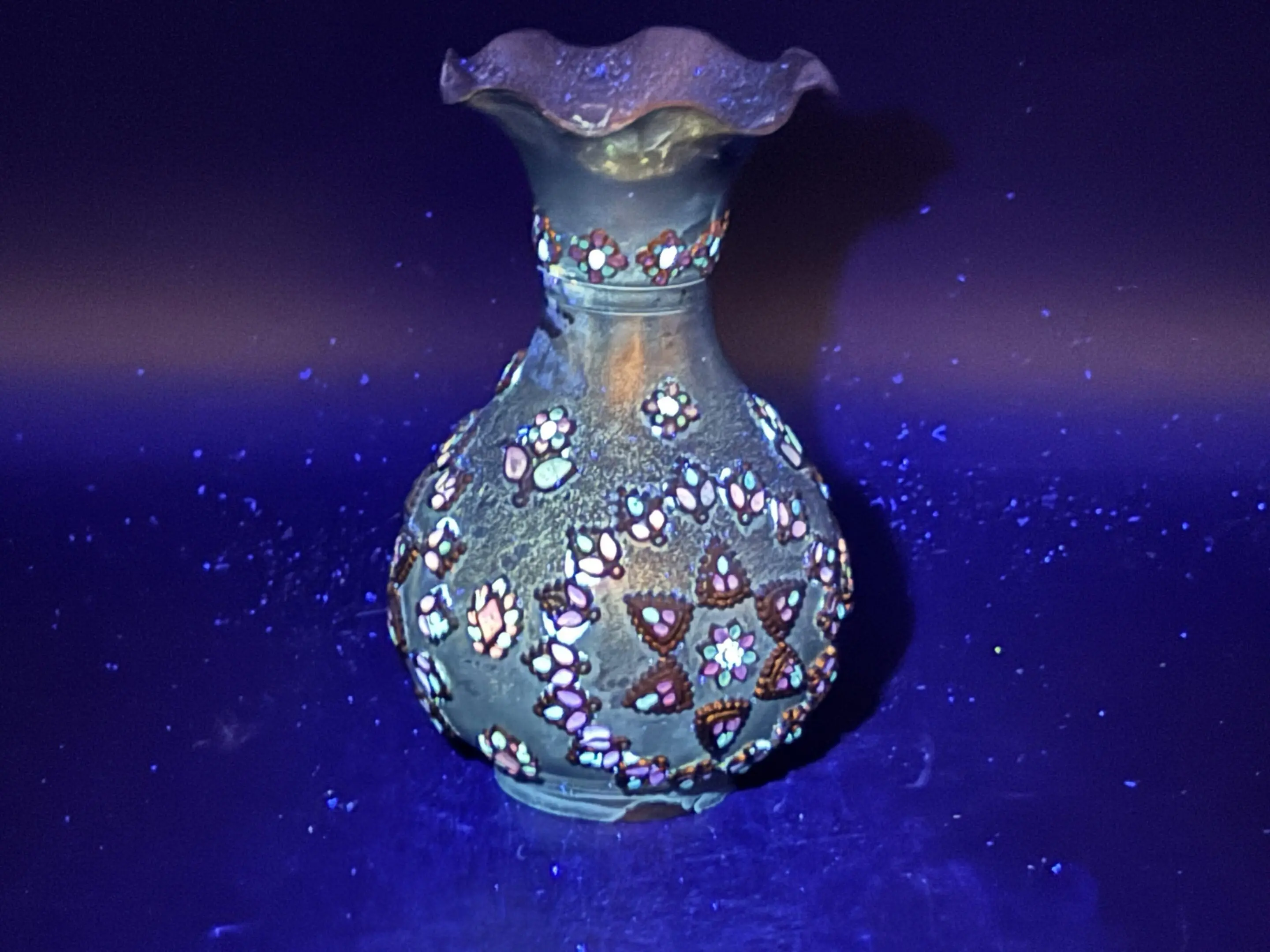 Beautiful antique brass vase with stunning enameled floral embellishments that glow under “UV” light. Made in India in the late 19th century. This vase is a fabulous find for the brass collector!