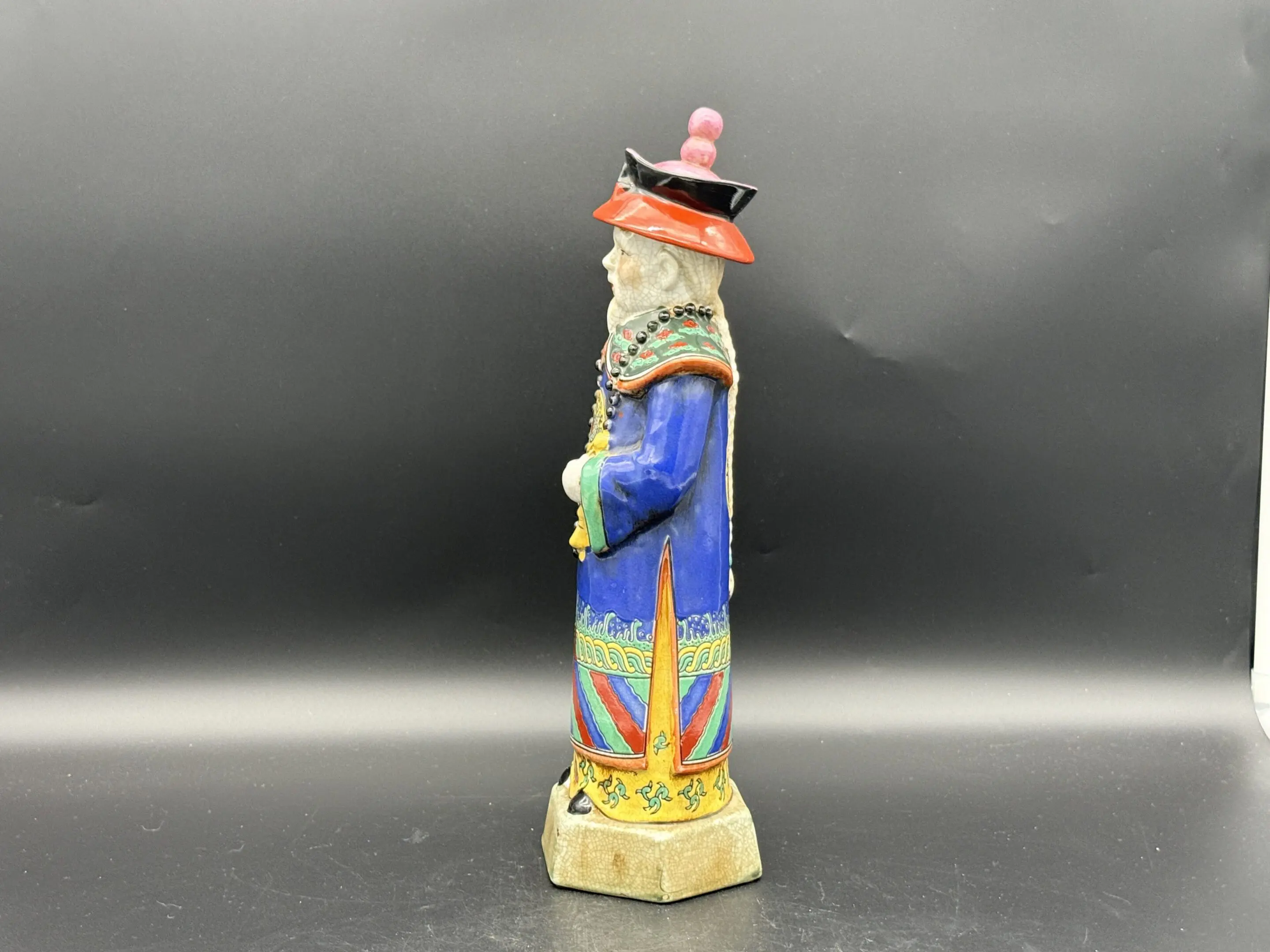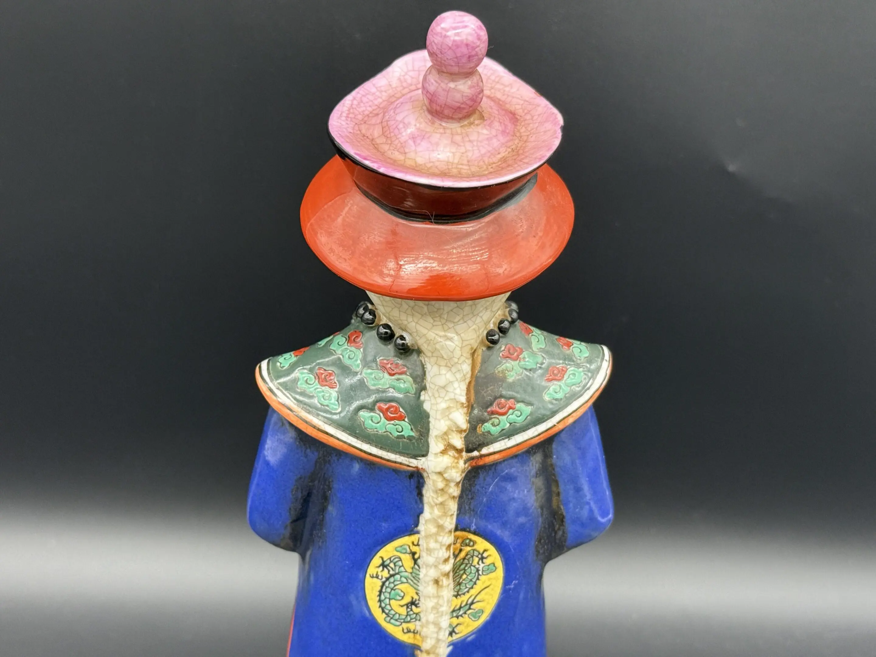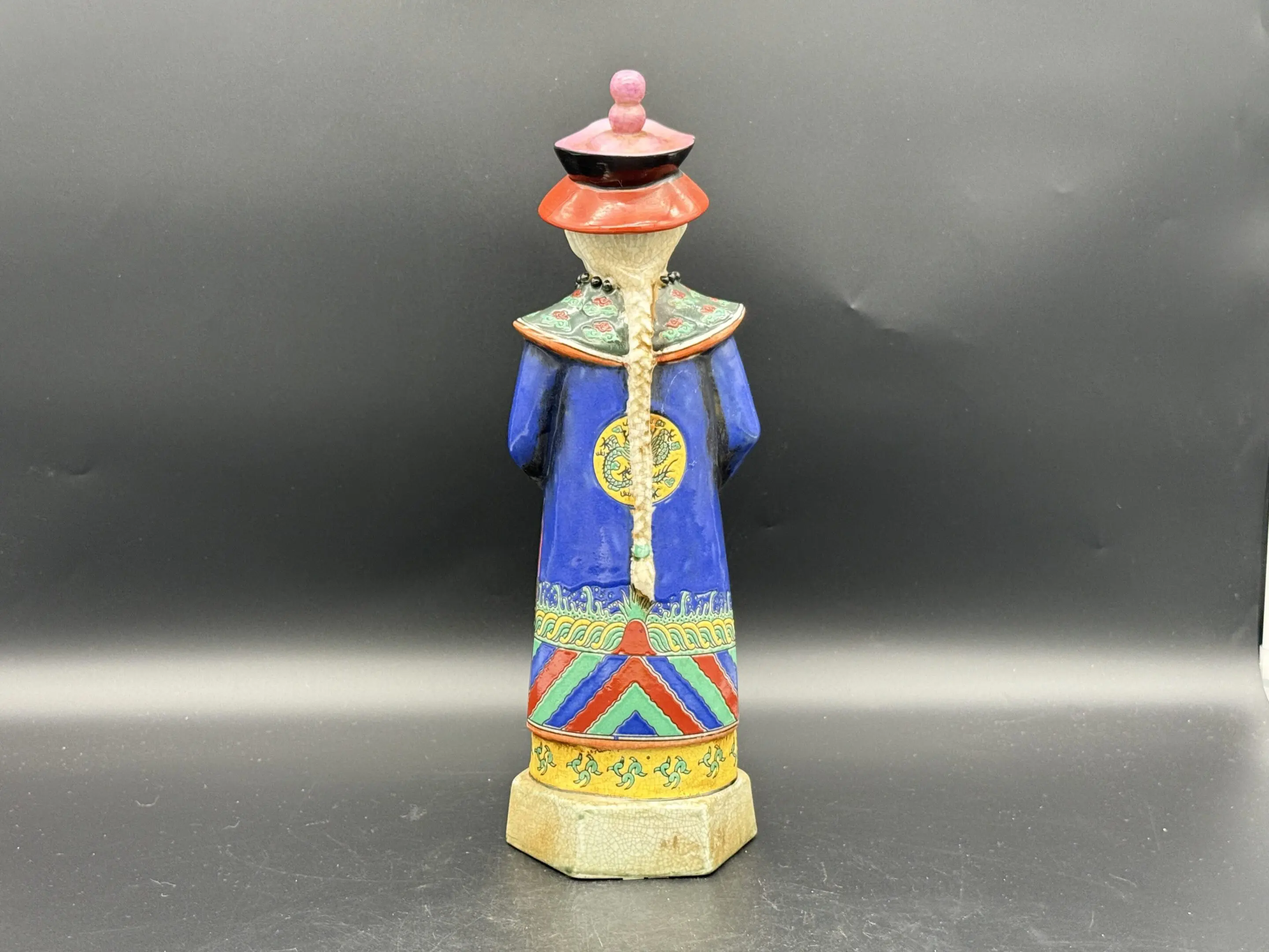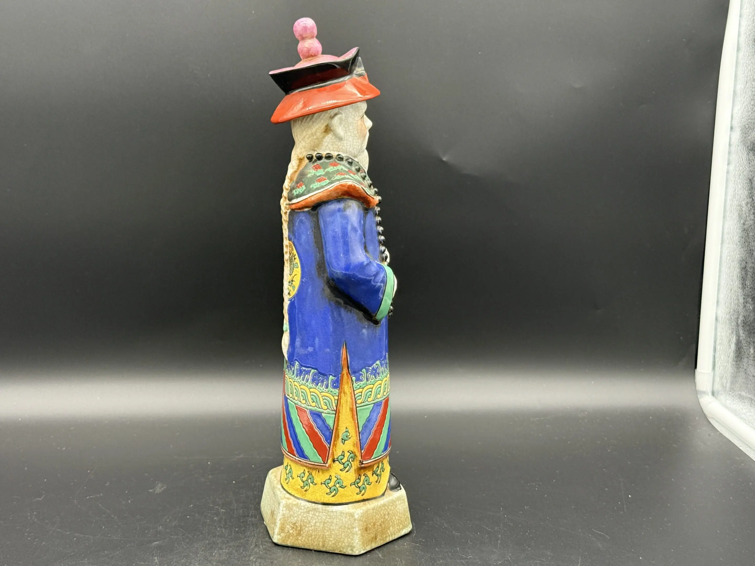 This particular figurine, likely representing an Emperor such as Yongzheng, showcases typical Qing attire and regalia, including the distinctive hat, robes adorned with symbolic motifs, and ceremonial jewelry. The porcelain figurine stands 14 inches tall and is in excellent condition.