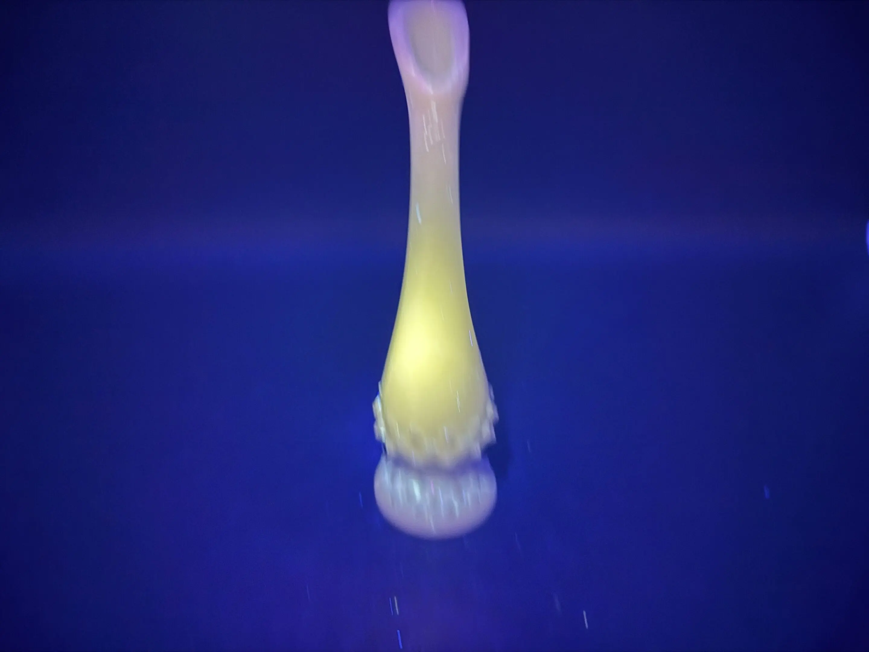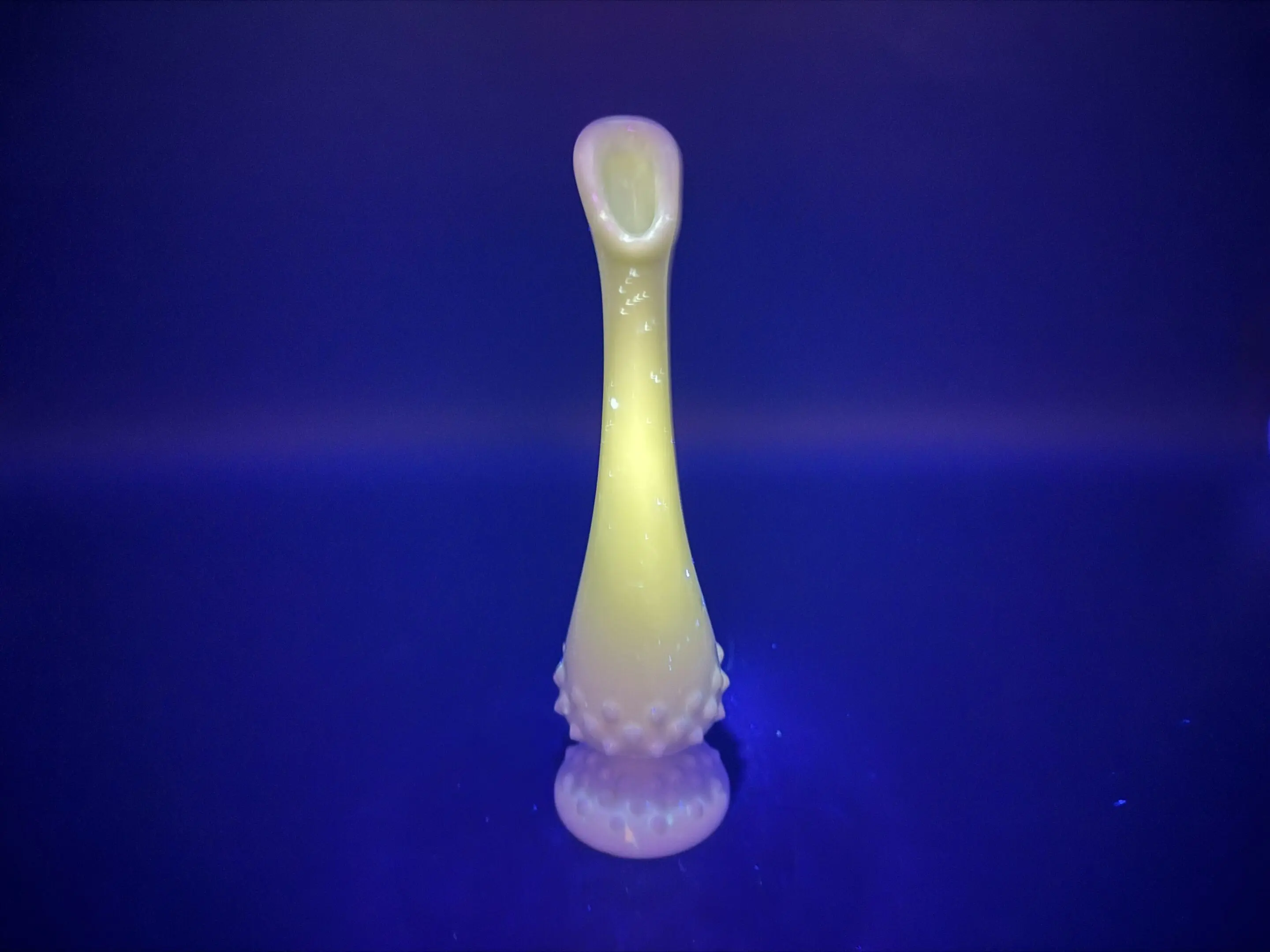 This Fenton milk glass swung bud vase stands 8.5″ tall and has a brilliant green glow under UV light.