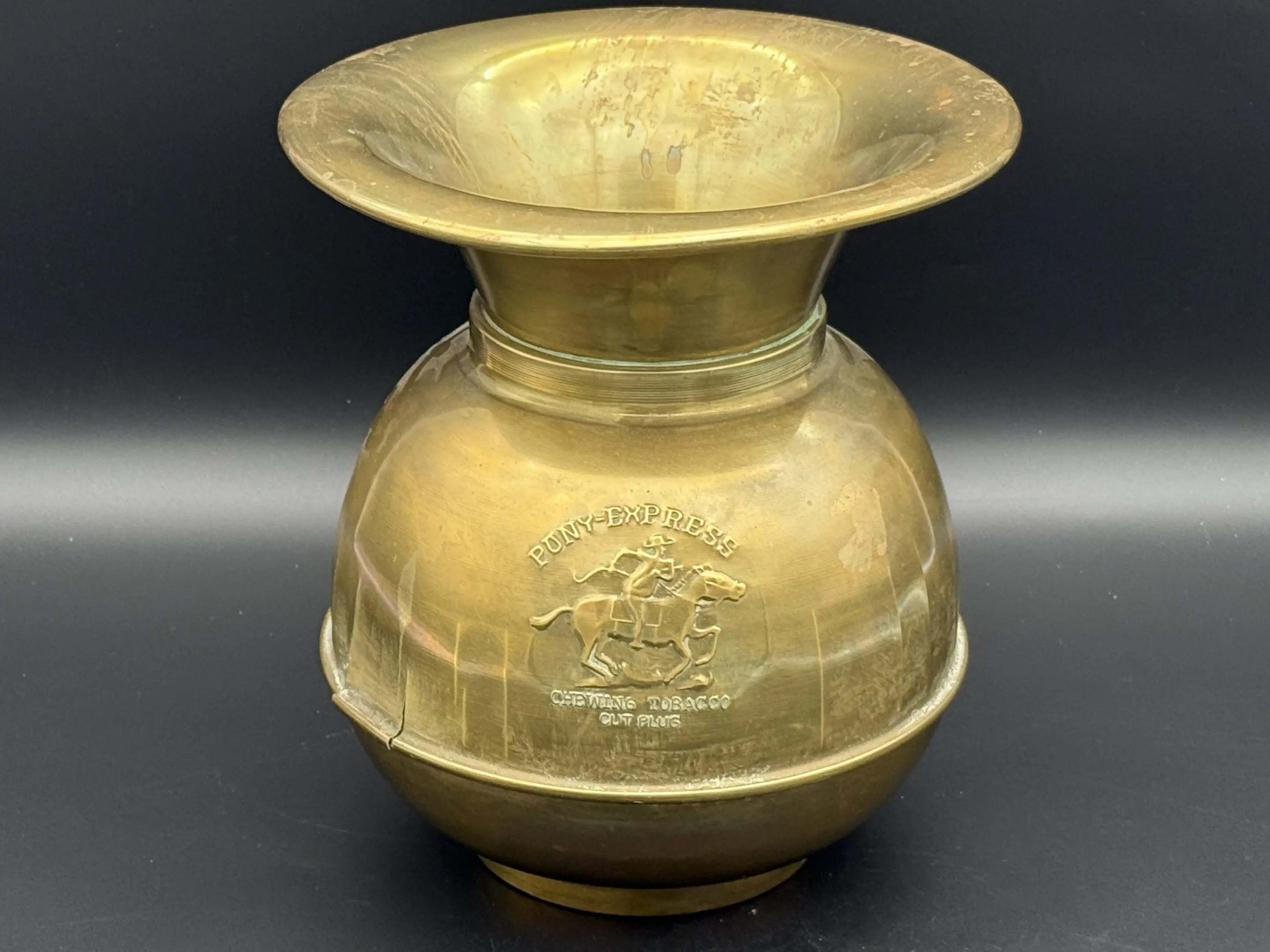 This vintage spittoon brass piece will stand the test of time. Adorned with the Pony Express logo and stands 10 inches tall. An impressive addition to any collection!