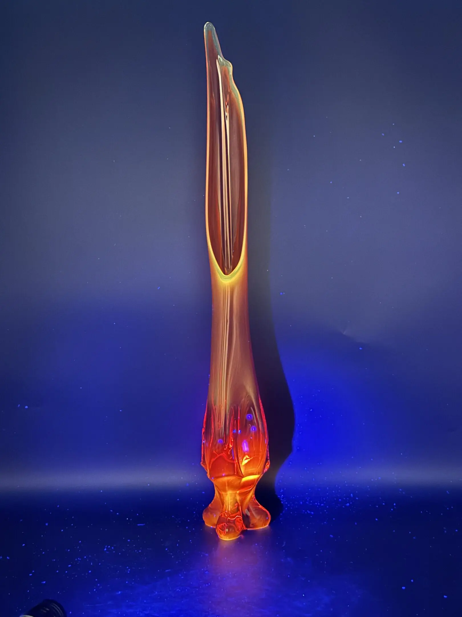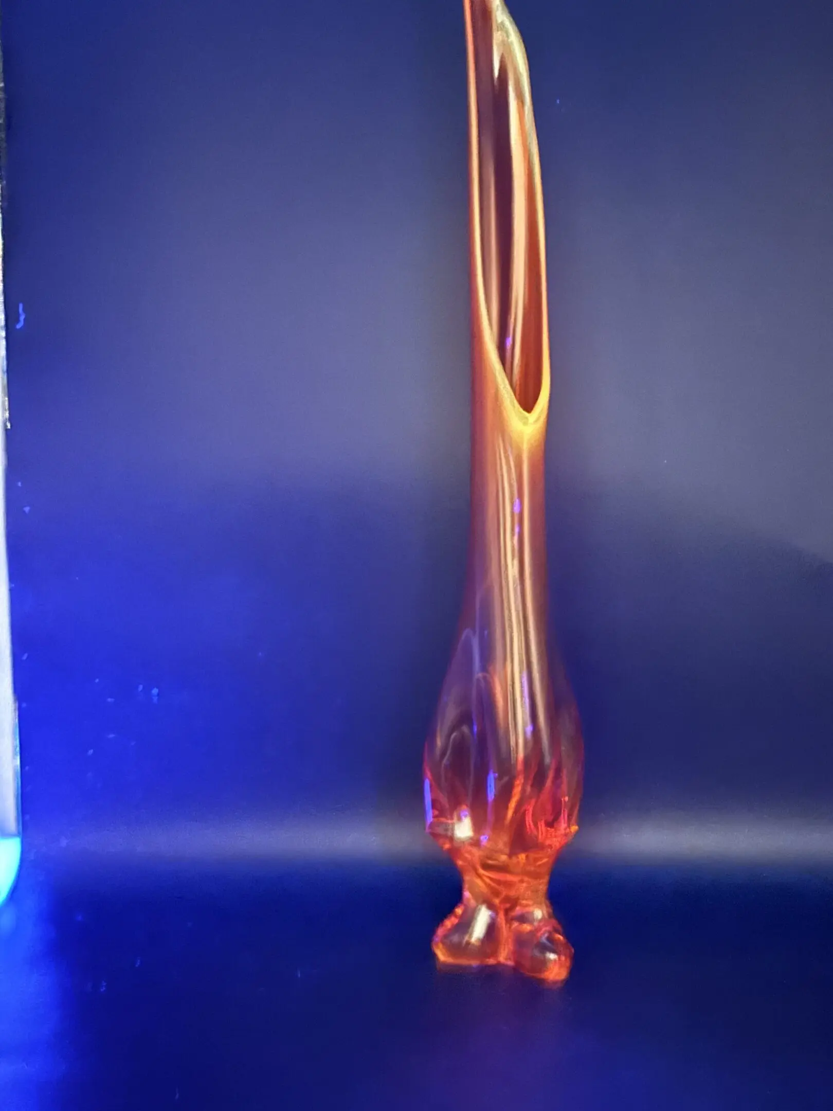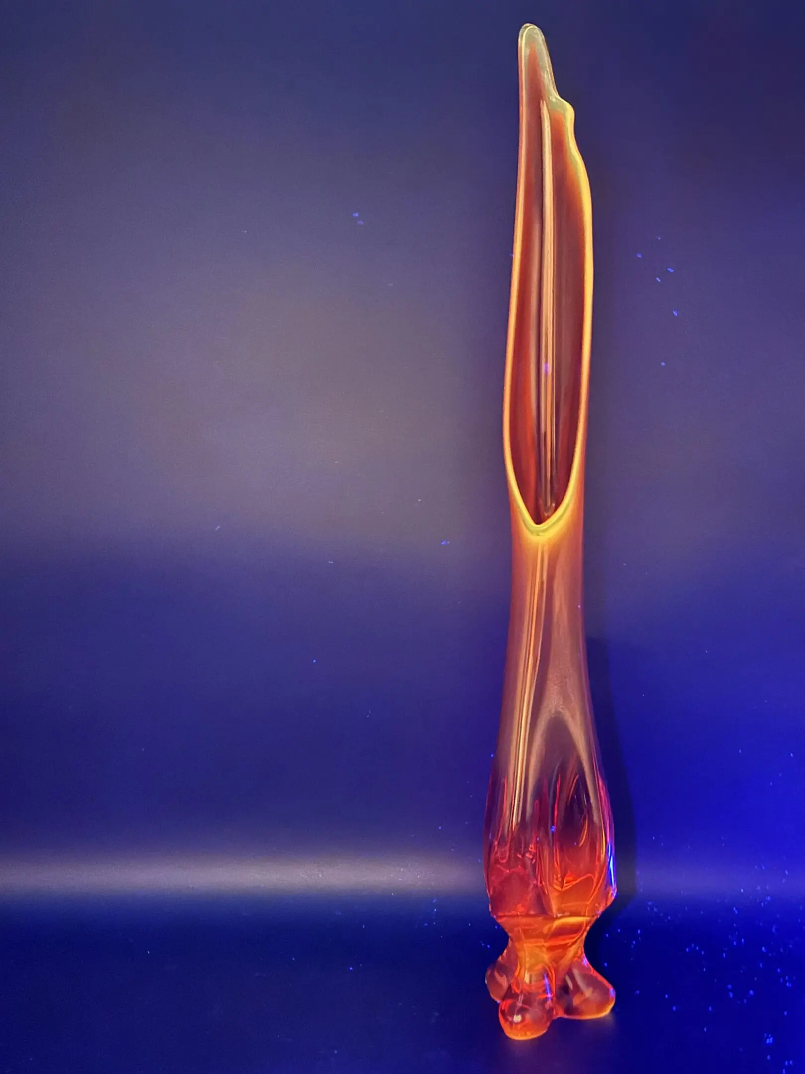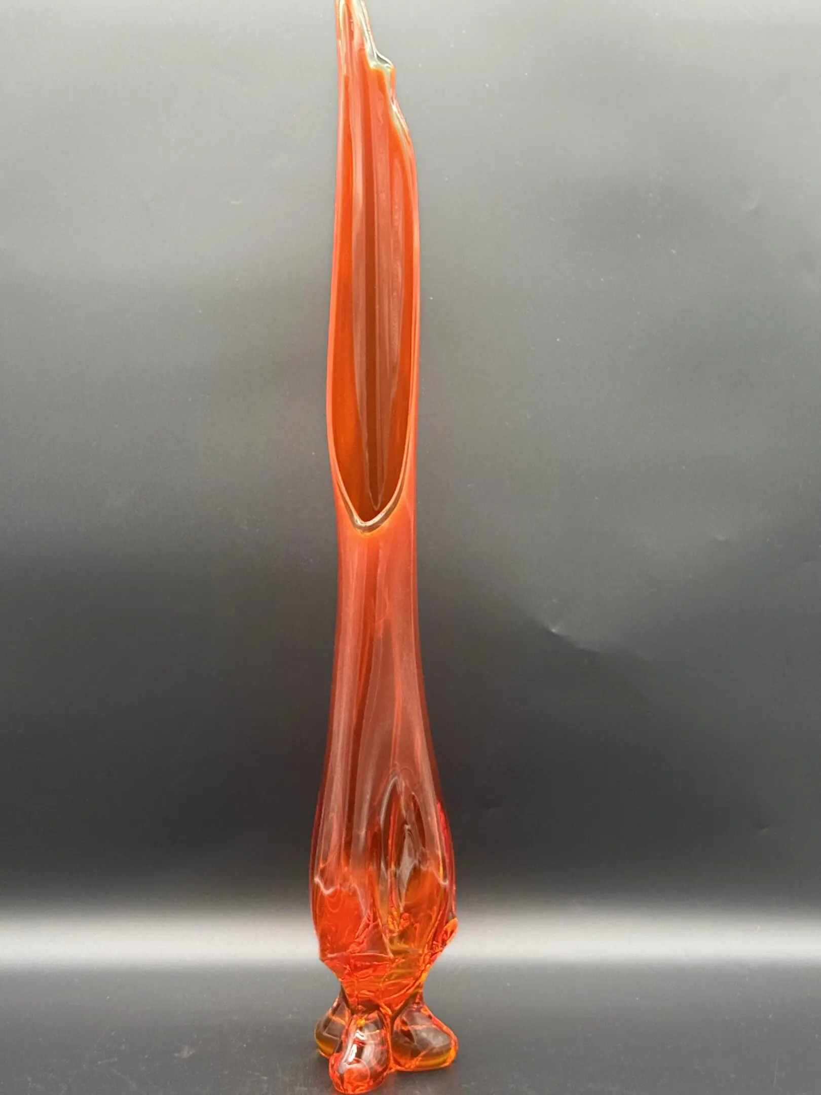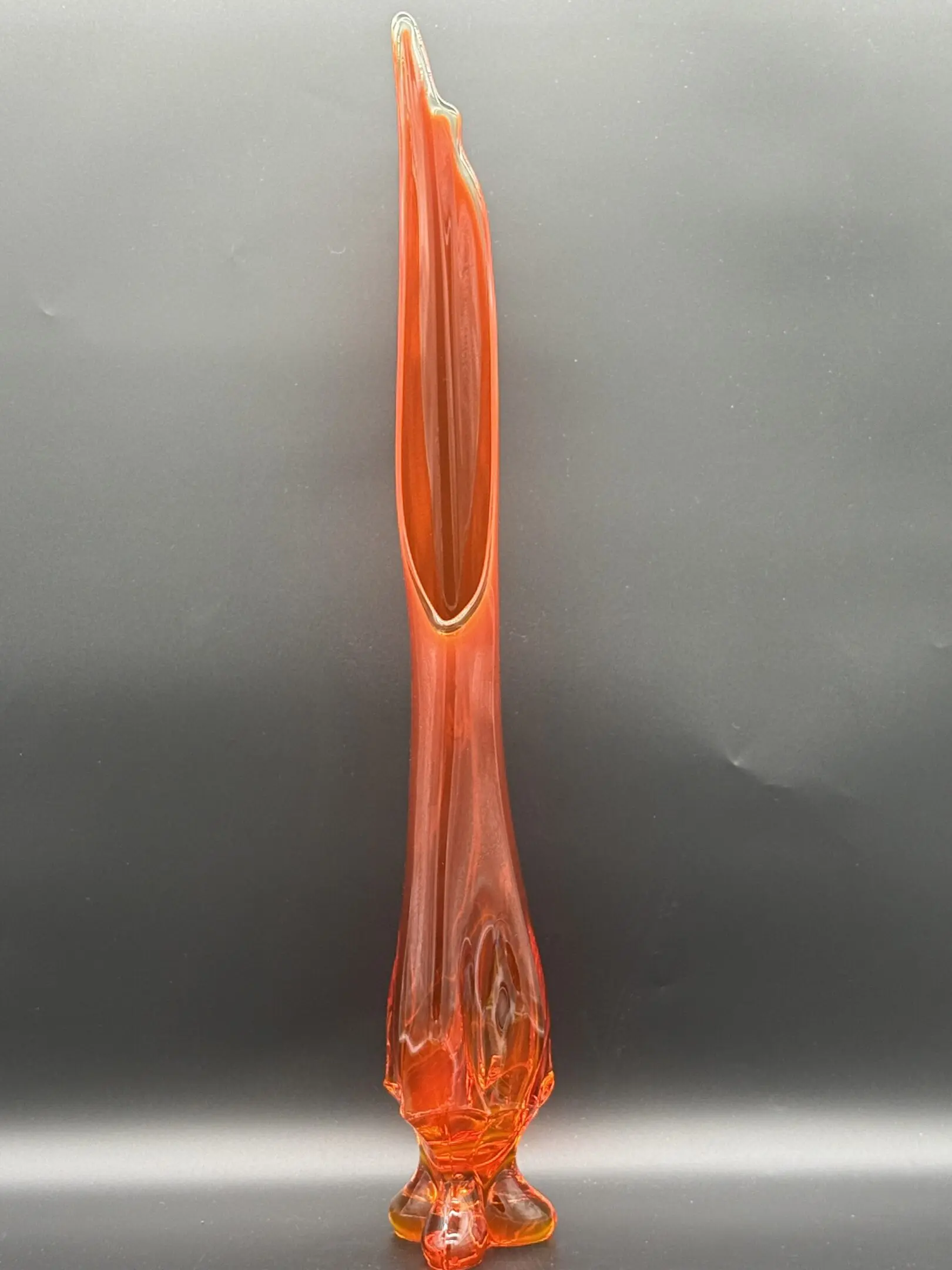 This 24-inch tall Persimmon amberina swung art glass vase with distinctive red and yellow coloration was popular in the mid 20th century. Many examples, especially those made with uranium oxide, exhibit a beautiful glow under ultra violet light contributing to their appeal.
