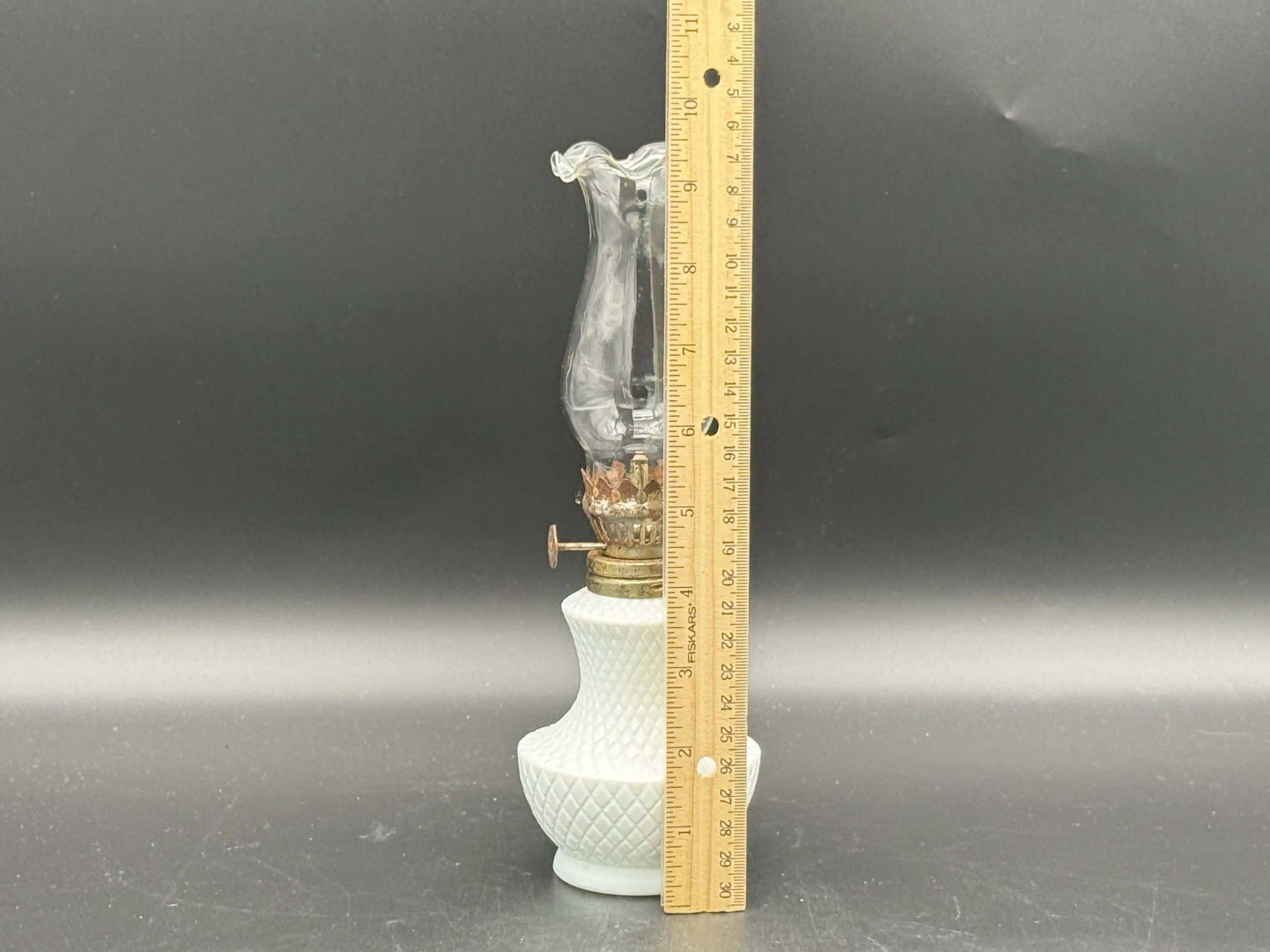 Vintage white milk glass kerosene lamp with ruffled clear glass chimney and glows a green under UV light. Produced in 1930s and is in excellent condition.