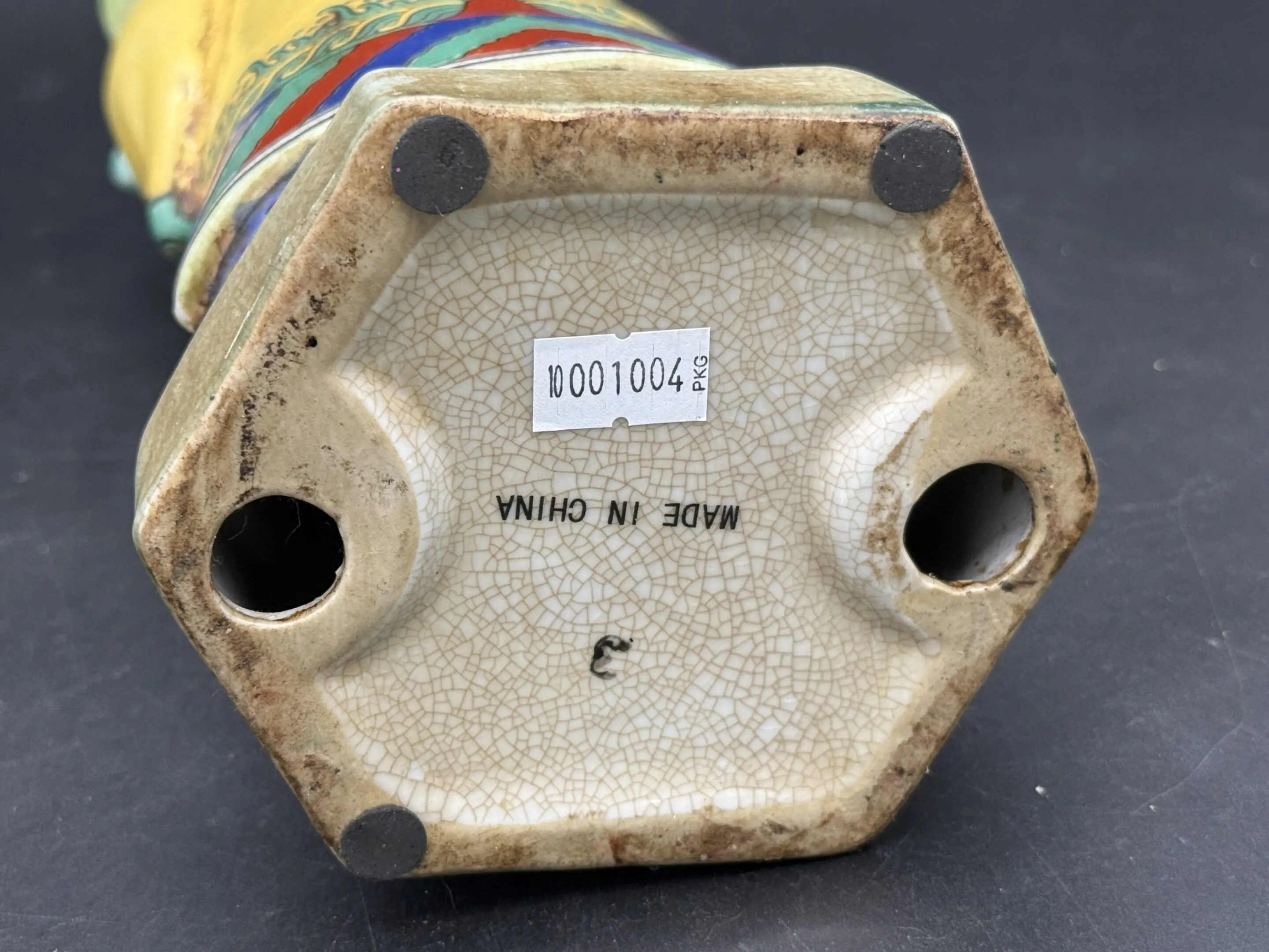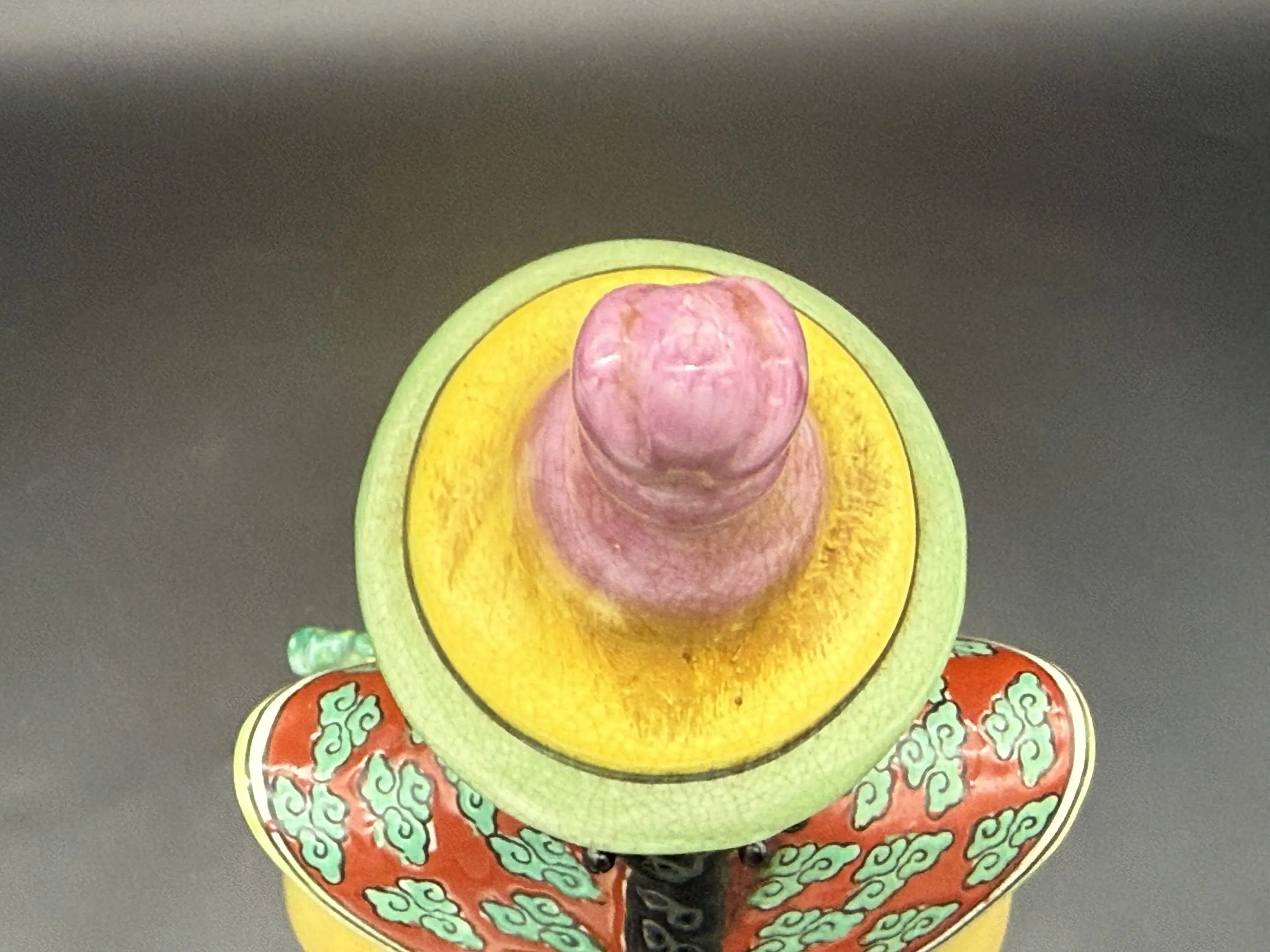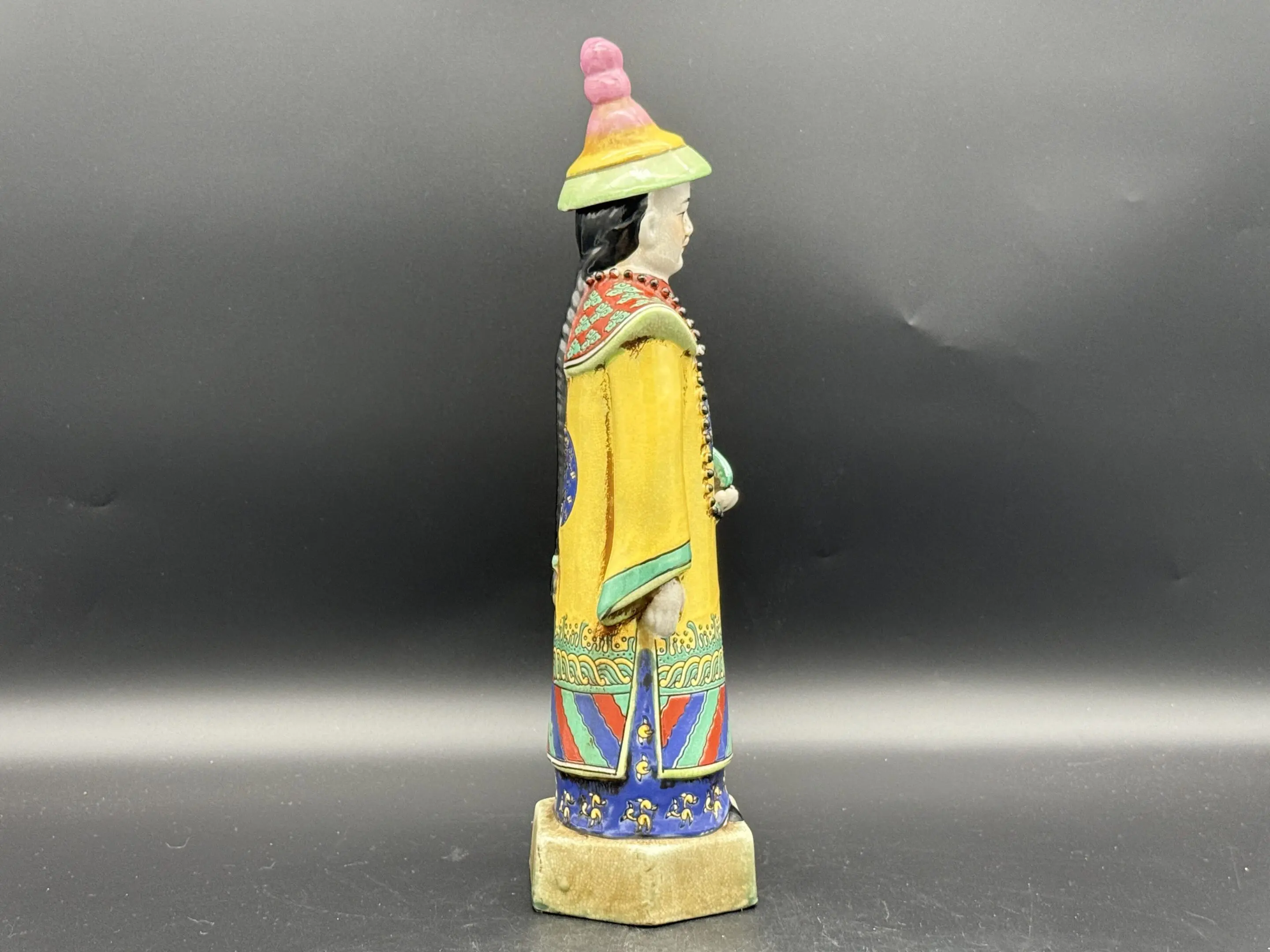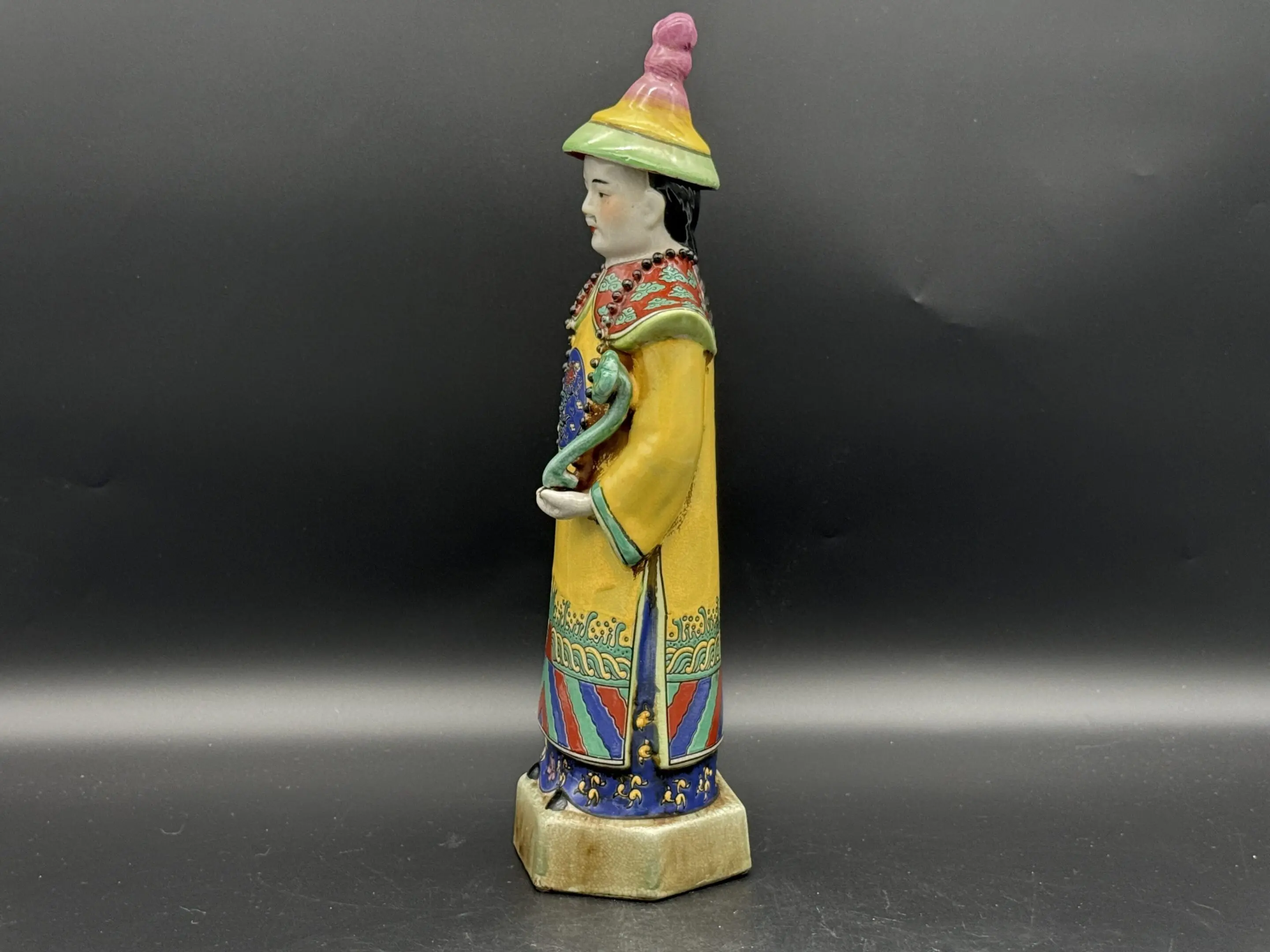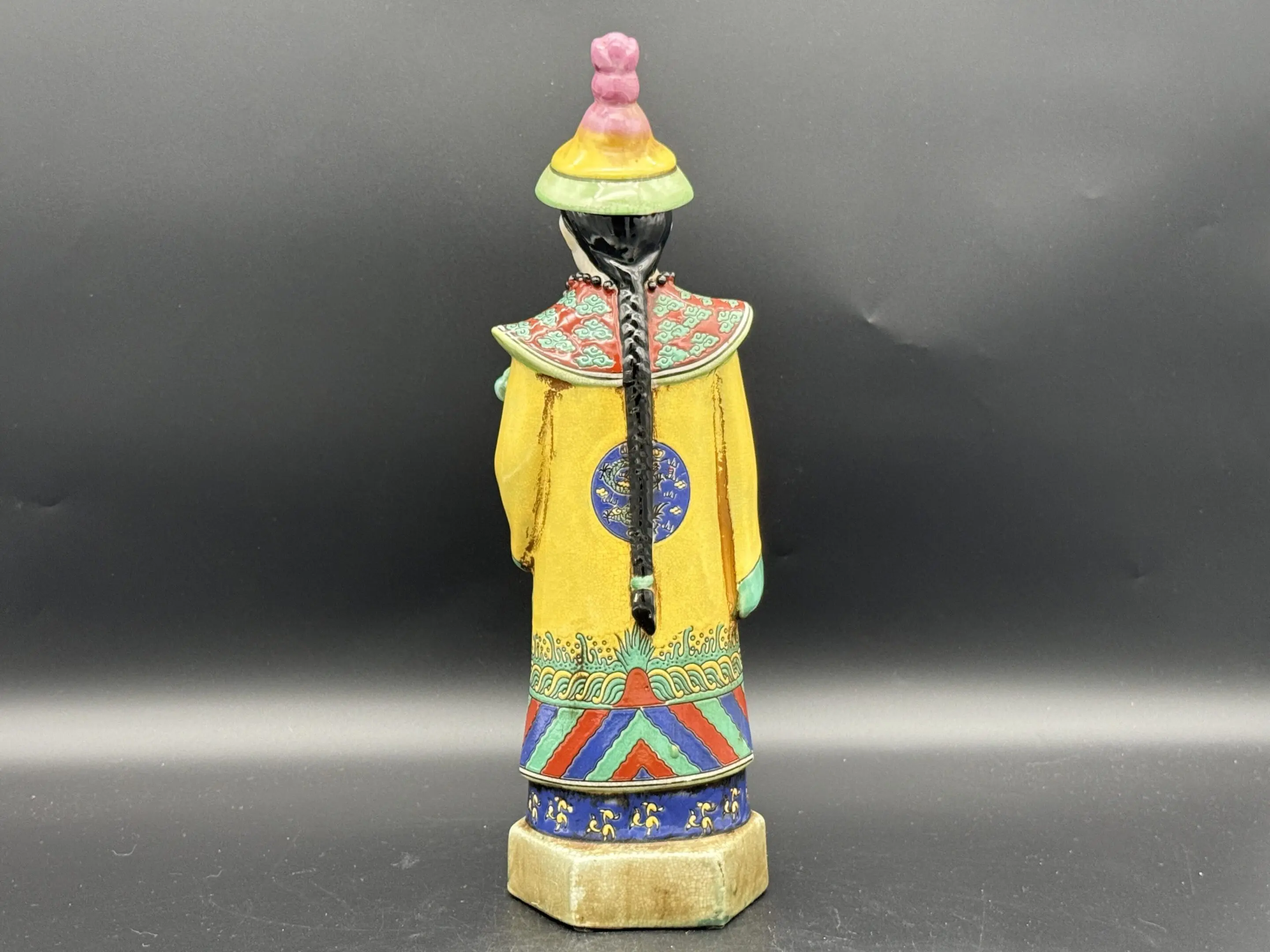 This is a beautiful Chinese Emperor hand painted porcelain figurine is Circa 1960s.  This figurine with its vibrant colors and detailed attire is characteristic of decorative porcelain produced in China during the mid 20th century. The ‘Famille Jaune’ (yellow family) palette evident in the dominant yellow robe is a well know style in Chinese porcelain. This figurine stands 15 inches tall and 4.5 inches wide.