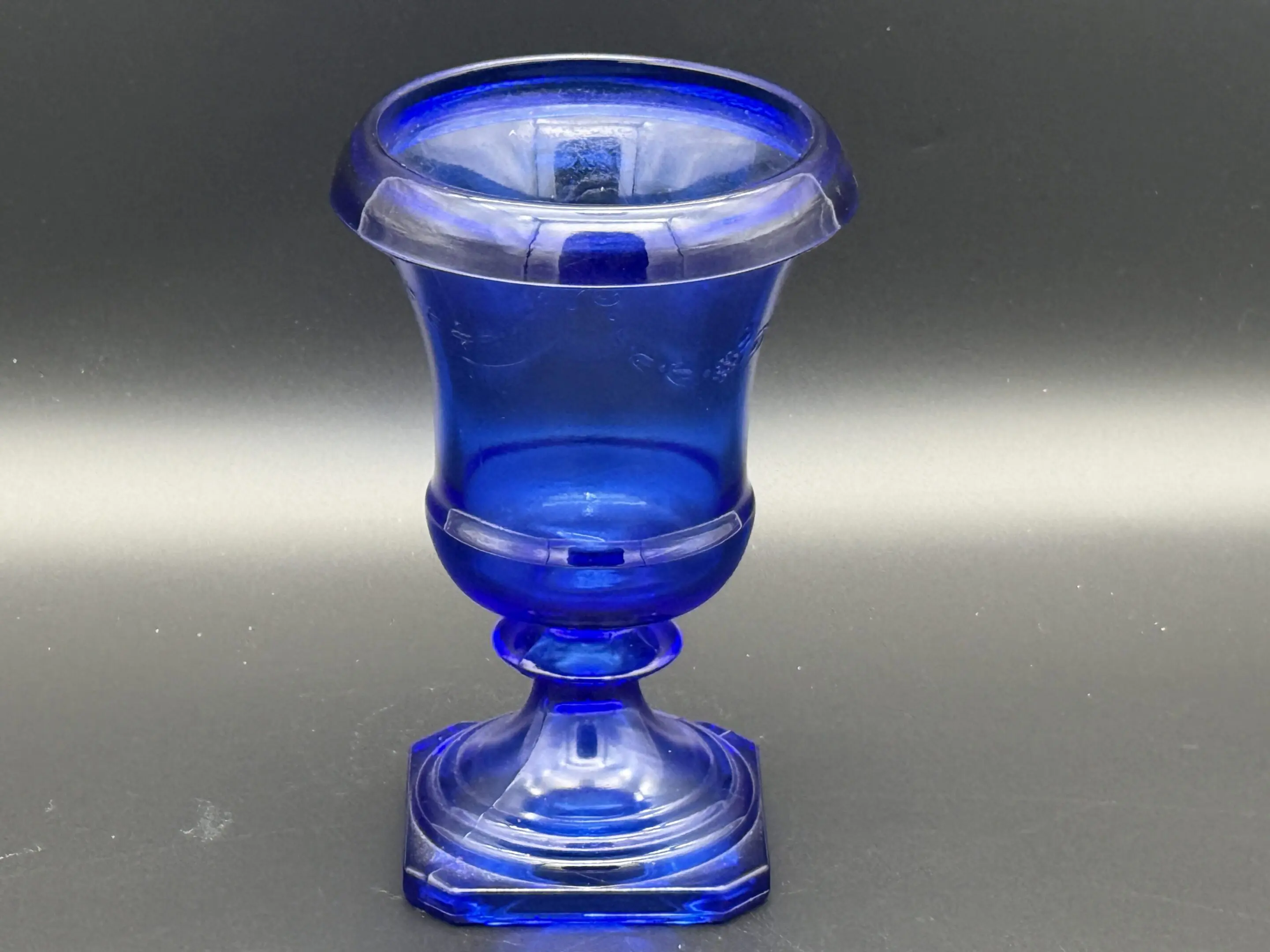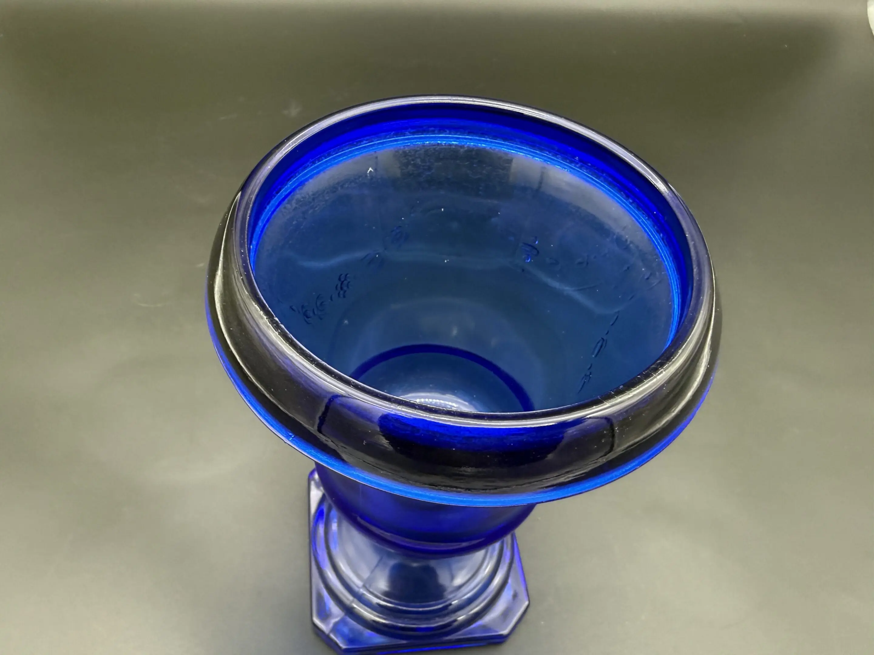 This beautiful L. E. Smith glass vase stands 7.25″ tall and is 4.5″ wide at top, and has a beautiful glow under UV light.